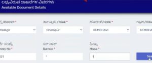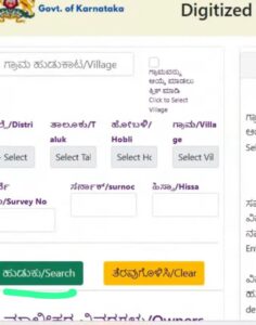 3. ಇಲ್ಲಿ ನಿಮ್ಮ ಜಿಲ್ಲೆ, ತಾಲೂಕು, ಹೋಬಳಿ ಮತ್ತು ಗ್ರಾಮದ ಹೆಸರನ್ನು ಡ್ರಾಪ್‌ಡೌನ್ ಪಟ್ಟಿಯಿಂದ ಆಯ್ಕೆ ಮಾಡಿ. ನಂತರ ನಿಮ್ಮ ಜಮೀನಿನ ಸರ್ವೆ ನಂಬರ್ ಅನ್ನು ನಮೂದಿಸಿ ಸರ್ಚ್ ಬಟನ್ ಮೇಲೆ ಕ್ಲಿಕ್ ಮಾಡಿ.
